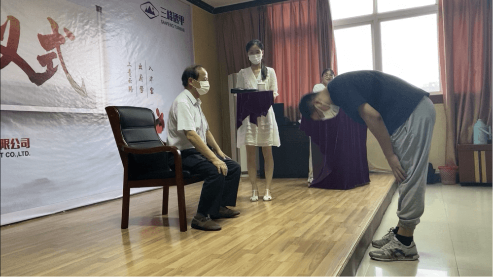 徒弟向師父行拜師禮、敬茶,師傅回贈禮品,師徒們從此結下深厚的師生情誼。